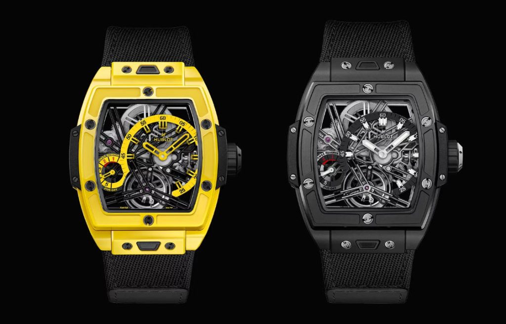 There are four new ceramic colourways available, borrowing hues from different corners of AAA fake Hublot watches lineup: this particular model of Spirit was previously only available in white ceramic or carbon, except for a couple of ultra-limited editions. We have a bold red ceramic, which is notoriously hard to create, along with yellow, black and the stunning sky blue. Additionally, Hublot has gone all out and made a full black sapphire version, too. Both styles have managed to maintain the relatively simple functionality of the Spirit case, featuring 30-meter water resistance and sapphire crystals on both the front and back, ensuring a sealed design.